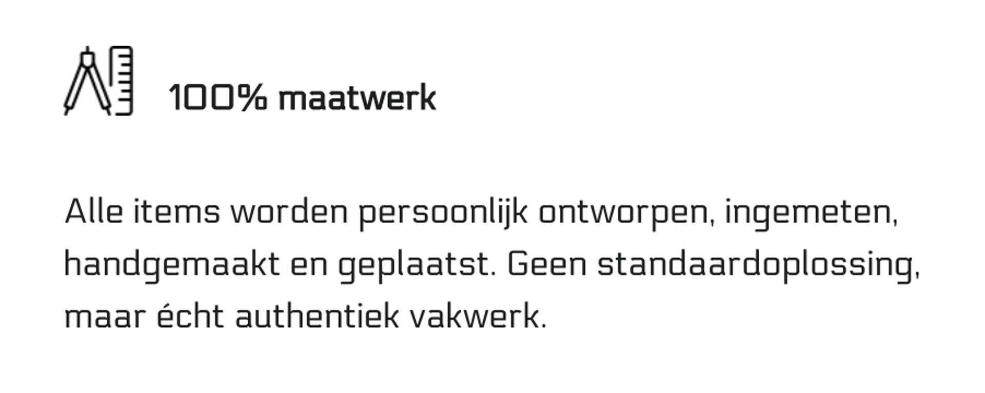 Alle items worden persoonlijk ontworpen, ingemeten, handgemaakt en geplaatst. Geen standaardoplossing, maar écht authentiek vakwerk.