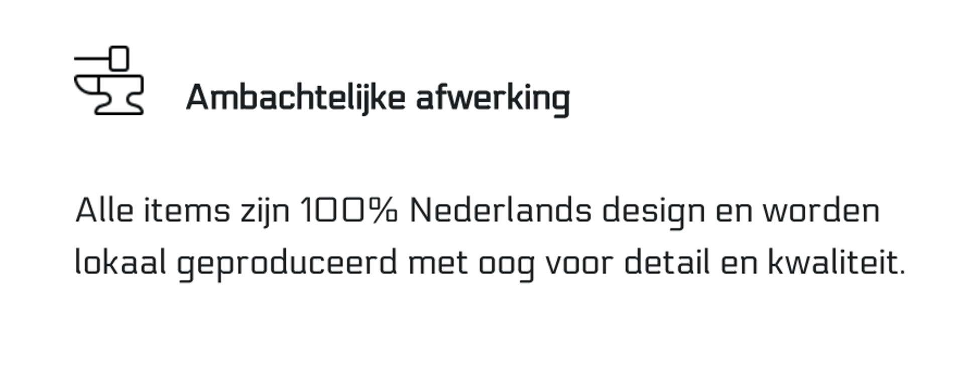 Alle items zijn 100% Nederlands design en worden lokaal geproduceerd met oog voor detail en kwaliteit.