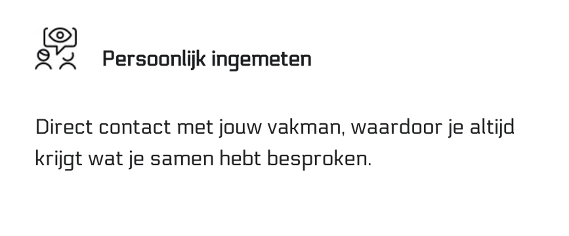 Direct contact met jouw vakman, waardoor je altijd krijgt wat je samen hebt besproken.