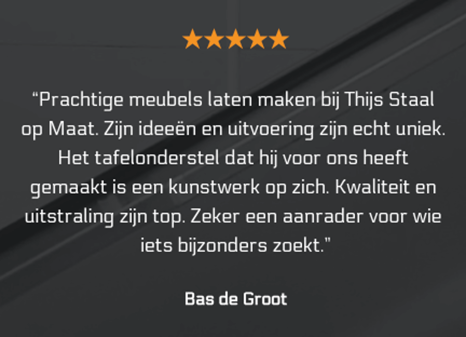 “Prachtige meubels laten maken bij Thijs Staal op Maat. Zijn ideeën en uitvoering zijn echt uniek. Het tafelonderstel dat hij voor ons heeft gemaakt is een kunstwerk op zich. Kwaliteit en uitstraling zijn top. Zeker een aanrader voor wie iets bijzonders zoekt.”