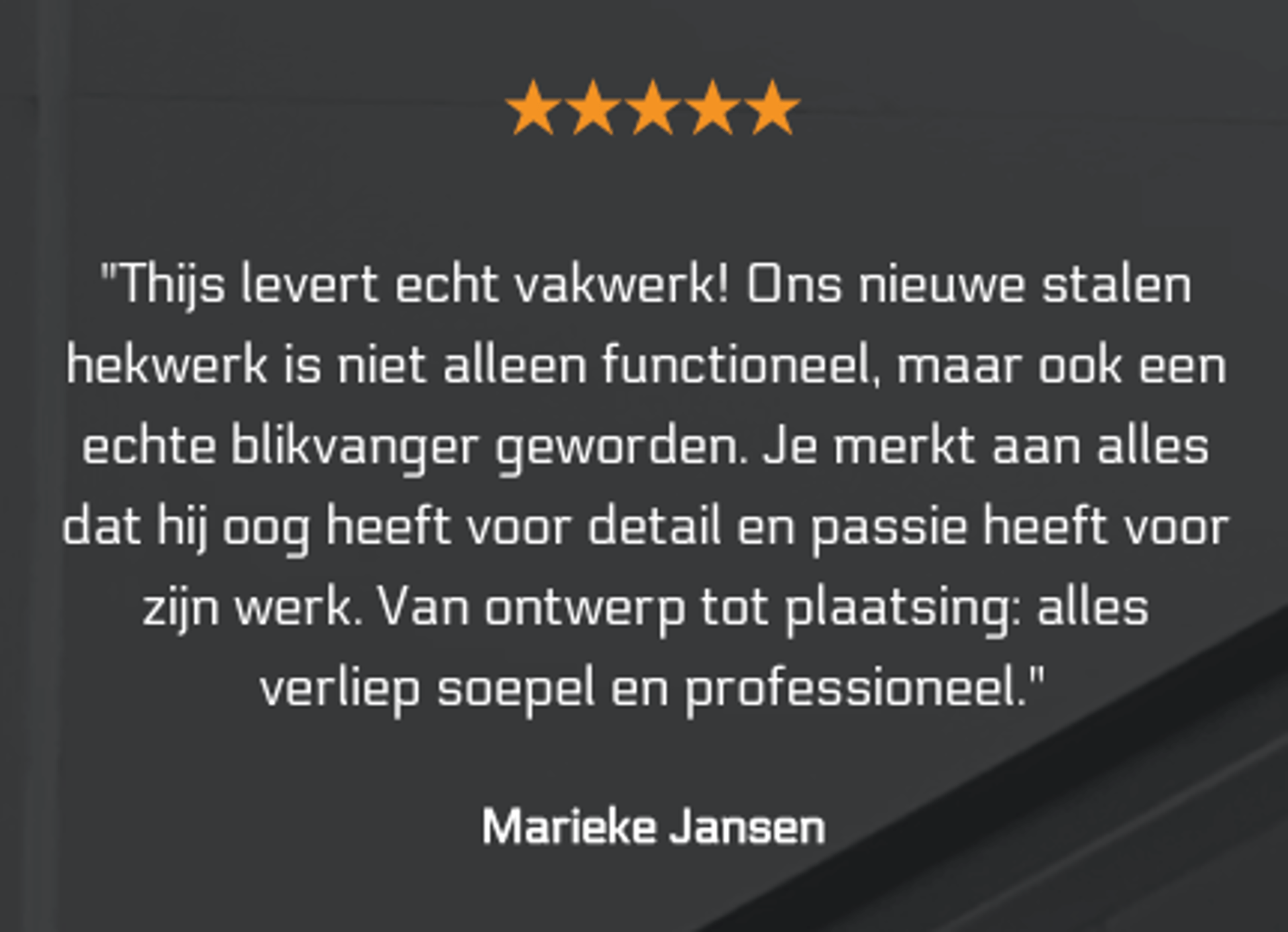 "Thijs levert echt vakwerk! Ons nieuwe stalen hekwerk is niet alleen functioneel, maar ook een echte blikvanger geworden. Je merkt aan alles dat hij oog heeft voor detail en passie heeft voor zijn werk. Van ontwerp tot plaatsing: alles verliep soepel en professioneel."